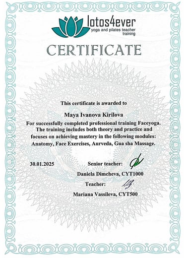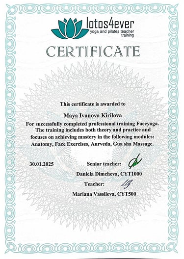 Мая Кирилова - сертифициран фейс йога инструктор и арома консултант. Посветих се на естествената грижа за лице и тяло. Съчетавайки фейс йога, ароматерапия и естетика, помагам на жените да открият своята истинска красота. Вярвам в силата на природата като най-добрия съюзник за хармония, здраве и сияйно излъчване.